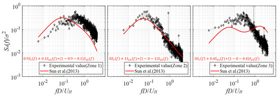 Figure 17 shows a comparison of the pressure spectra. The spectral model proposed by Sun et al. [14], which was used for comparison, is marked with a solid red line, and the weight coefficients used in the calculations are shown in the graph. Although the dome center showed relatively good agreement, there were significant differences between the two pressure spectra in Zones 1 and 3. For the target of this study, a dome roof with f/D = 0.1, the windward zone (Zone 1) is more affected by vortices owing to separation than by the turbulence in the approaching flow. However, for f/D = 0.14, as is evident from the weight coefficients, the turbulence of the approaching flow had a greater impact. Zone 3 was affected by wake turbulence, where the second peak frequency was lower and the energy was higher than those reported by Sun et al. [14]. This is attributed to the difference in the model dimensions and the low f/D. The pressure spectra proposed by Sun et al. [14] also have limitations in their application to the target of this study, that is, a dome roof with f/D = 0.1, because the flow patterns around the dome roof are different.