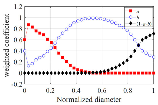 Figure 18 shows the weighted coefficients , , and based on the wind pressure taps on the centerline. The x-axis represents the normalized diameter. Coefficient , representing the contribution of separation-induced turbulence in the approaching flow, was distributed over normalized diameters from 0 to 0.35, whereas , representing the contribution of wake-induced turbulence, was distributed only for normalized diameters greater than 0.75. Finally, the coefficient , which represents the contribution of the approaching flow turbulence, roughly shows a parabolic distribution over a wide range centered around the normalized diameter of 0.5, which is the dome center.