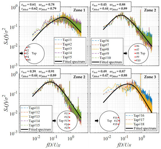 The target and simulated pressure spectra of the three zones (h/D = 0.5 and f/D = 0.1) are shown in Figure 19. The solid black line in the graph represents the proposed spectral model calculated using Equation (11). As observed in the graph, the pressure spectra modeling results were considered satisfactory. Additionally, the accuracy of the simulated pressure spectra was assessed based on spectral statistics. The ε and ω values marked at the top of the graph represent the irregularity factor and bandwidth parameter, respectively. Both the parameters have values between 0 and 1, with ε = 1 and ω = 0 representing a pure narrowband process and ε = 0 and ω = 1 representing a pure broadband process. The parameters were calculated using the expression proposed by Kumar and Stathopoulos [11], which indicated that the accuracy of the experimental values and simulated pressure spectra was very high.