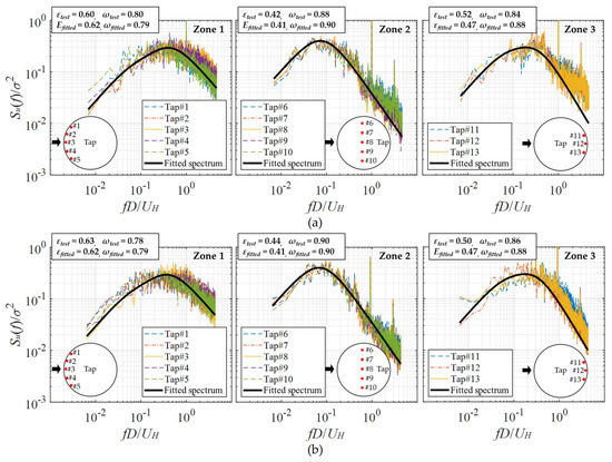 where and are the total contributions of the building-generated turbulence to the wind pressure fluctuations, is the contribution of the approaching turbulence to the total pressure fluctuation, is the pressure spectrum in Zone 1 of the windward area, is the pressure spectrum in Zone 2 at the center of the dome area, is the pressure spectrum in Zone 3 of the leeward area(Figure 15a). For dome roofs with a low f/D, the windward zone is dominated by the effect of the vortex caused by separation rather than the approaching turbulence, and the center of the dome is characterized by a spectral shape that is more similar to that of the approaching turbulence. In Section 4.1, Uematsu et al. [12] and Sun et al. [14] used the pressure spectrum in the windward area; however, in the modified proposed modeling function, the pressure spectrum was used in the windward area (Zone 1), and the pressure spectrum was used in the center of the dome (Zone 2). Consequently, the weighted coefficients of the spectra in each zone have different meanings. In other words, and represent the contributions of the vortices generated by the separation in Zone 1 and the wake in Zone 3, respectively. Additionally, because the wind speed and pressure spectra were similar at the dome center, Zones 2 and were defined as the contributions of the approaching turbulence. The weighted coefficient values of and were evaluated using a nonlinear least-squares program based on wind tunnel test results.