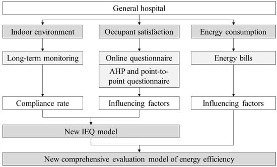 In summary, existing general hospitals in China face various challenges related to IEQ, energy consumption, and user satisfaction. These challenges include excessive CO2 concentration, high PM2.5 concentration, bacteria, dense human flow, and low user satisfaction. Hospital equipment and high energy density contribute to significant building energy consumption intensity. The indoor environment, satisfaction, and energy consumption characteristics of different departments in the hospital have not been effectively mastered, and their correlation in hospitals remains insufficient. There is no clear and consistent conclusion as to the significance and size of inter-group differences in occupant satisfaction (between different jobs, working hours, gender, etc.), and most studies focus on thermal environments []. Furthermore, at present, most studies only selected one factor of energy consumption or environment to carry out in-depth analysis, resulting in a lack of comprehensive evaluation. Balancing the relationship between satisfaction, IEQ, and energy consumption is crucial for building energy efficiency, leading to a lack of targeted guidance for the design and operation of general hospital buildings []. The framework of this study is depicted in Figure 1. The novelty and originality of the paper was as follows: