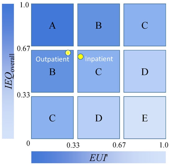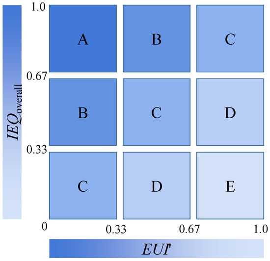 Due to the direct impact of usage time on building energy consumption, Equation (2) was used to correct the evaluation of energy consumption by considering the direct impact of usage duration on energy consumption intensity. To create a good indoor environment, it is bound to consume more energy. The performance evaluation results based on IEQ, EUI, and the grading of comprehensive evaluation are classified into five levels (A–E) according to a previous study []. These levels are shown in Figure 2, with Level A representing optimal performance. To achieve Level A, the IEQ must be at least 0.67. The purpose of this classification is to encourage the improvement of indoor environment and reasonably control the energy consumption. Even if the energy consumption is low, but the IEQ is poor, it will not be defined as an excellent level.