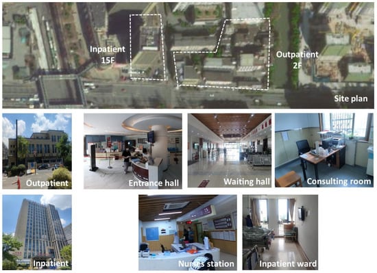 The hospital selected for this study is the Hangzhou Integrative Medicine Hospital, established in 1956. It is a modern and comprehensive facility that combines medical treatment, scientific research, teaching, prevention, and health care services. The hospital is situated at No. 25 Shenjia Road, North East New Road, Hangzhou City, with a construction area of more than 20,000 square meters. It was opened in 2015, and the standard photos and layouts of the hospital can be seen in Figure 3 and Figure 4, respectively. Background information regarding the hospital is provided in Table 6. The outpatient department is located on the West side and comprises five low-rise buildings that are interconnected. The hospital has approximately 500 employees and is a second-level standard integrated traditional Chinese and Western medicine hospital.