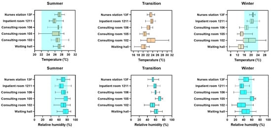 The distribution of air temperature and relative humidity in different areas of the hospital (the blue highlights mean the requirement of standard).