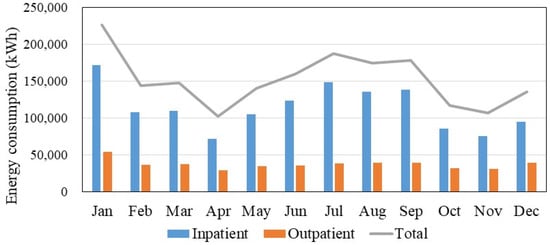 The study included energy consumption statistics for primary energy sources (natural gas, coal) and secondary energy sources (electricity, oil). However, this building solely relies on electricity and does not utilize natural gas or any other types of energy. The tested building did not have a building energy management system (BEMS) installed; therefore, energy consumption data were obtained through regular meter readings. The energy consumption quota and calculation method for medical institutions were based on the quota and calculation method of energy consumption for medical institutions DB33/T 738-2021 []. Energy consumption includes the actual consumption of various physical amounts of energy in medical institutions, such as air conditioning, lighting, elevators, hot water energy, and medical equipment. The data collected consisted of the annual/monthly power consumption of hospital buildings, as well as the annual/monthly power consumption of departments or floors.