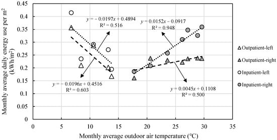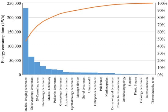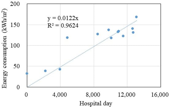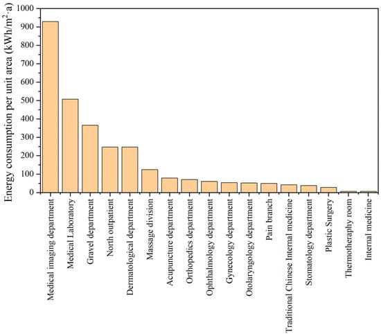 Hospital energy consumption exhibits certain patterns in time and space. As shown in Figure 8, the weather conditions directly affect the energy consumption. Meanwhile, hospital days were correlated with the energy consumption of inpatient departments. Additionally, the energy consumption of outpatient departments, except for the medical imaging department and the intensive care units, were similar to the regular office []. Due to the unique energy consumption characteristics of the medical imaging department and the intensive care units, it is recommended to conduct a zoning evaluation in hospital energy consumption evaluation.