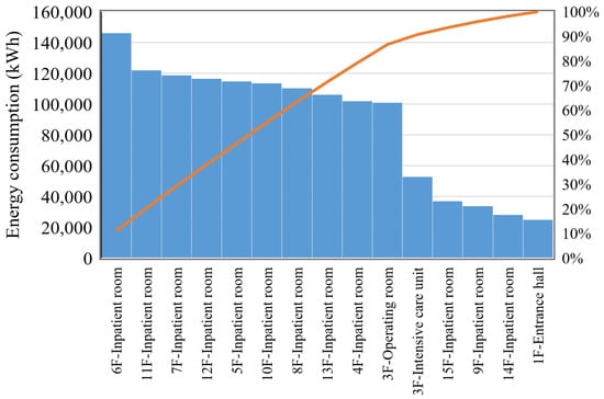 Energy consumption is a critical concern during hospital operation due to the continuous operation, energy-intensive systems, and large number of users []. It is widely believed that hospital buildings have the highest energy consumption among major commercial buildings []. In China’s comprehensive hospitals, daily energy consumption is mainly dominated by electricity, accounting for 66%, followed by gas []. Key medical equipment, such as computer tomography (CT) and magnetic resonance imaging (MRI) are major electricity consumers in hospitals []. Notably, healthcare activity, such as hospitalization stays, emergency actions, surgeries [] and maintenance [], air conditioning, and air cleaning consume about 40% of the total electricity. Furthermore, different departments of hospital had different energy demands []. Therefore, balancing the conflict between indoor environment quality (IEQ) and energy consumption in hospitals reasonably is crucial.