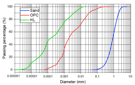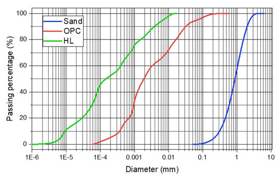To carry out this study, the following materials were used: Portland cement CP-II-E-32 (NBR 16697) [24], equivalent to CEM-I (EN 197-1) [25], hydrated lime CH III, washed river quartz sand, sodium hydroxide and potassium hydroxide solution with a 5% concentration. The chemical composition of Portland cement, hydrated lime and sand is presented in Table 1, while Figure 1 presents the granulometry of the materials. The chemical analysis of Portland cement, hydrated lime and sand was performed using energy-dispersive X-ray fluorescence (XRF) analysis. The granulometry of the materials was carried out by laser diffraction. The sand was passed through a 2.36 mm sieve.