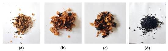(a) Natural coffee husk; (b) coffee husk treated with NaOH; (c) coffee husk treated with KOH; (d) coffee husk calcined.