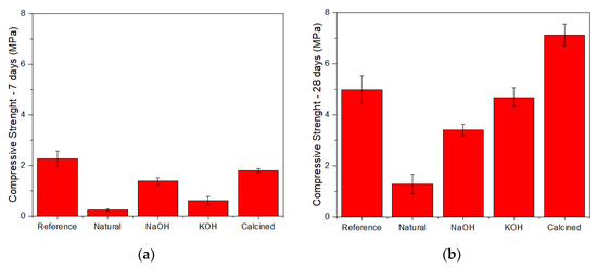 Compressive strength (a) after 7 days and (b) 28 days of curing the mortar with coffee husks.