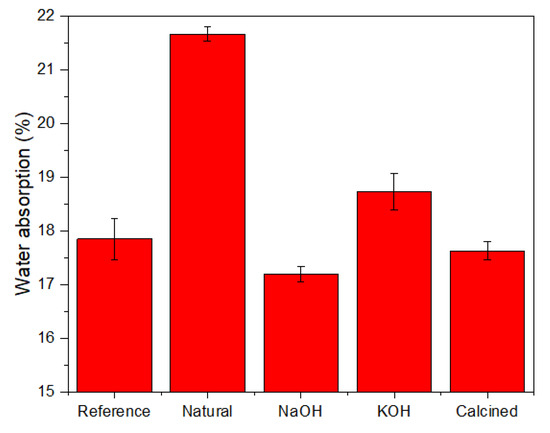Another important analysis for assessing the feasibility of using coffee husks in mortar for coating and laying blocks is water absorption, illustrated in Figure 4. Coffee husks are a porous organic material that decomposes more easily than industrialized materials, which may cause problems for the durability of the material [28]. In Figure 4, it is noted that the composition containing natural coffee husks showed water absorption of approximately 21.5%, indicating the hygroscopic nature of the material. This can be the result of the irregular and bulky size of the husk particles and the absence of treatments that eliminate its impurity. Mortars containing organic materials, even if treated, tend to show higher water absorption results than the reference mortars [40]. However, mortars containing coffee husks treated with NaOH and KOH present water absorption close to the reference value. This demonstrates the efficiency of alkaline treatments. Another important issue is related to the workability of the material.