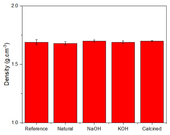Figure 5 presents the mass density results in the hardened state of mortars containing coffee husks, with 28 days of cure. The density results obtained ranged from 1.68 g·cm−3 to 1.70 g·cm−3, showing statistical equivalence according to the deviation bar. This may be due to the husk content used, which was 2.5% in relation to the cement mass. This value was maintained for all treatments. When comparing with other studies that incorporated 2.5% of natural fibers in mortars, such as that by Aquino et al. [10] and Azevedo et al. [40], similar results were obtained, with densities of 1.7 g·cm−3 for natural corn fiber and 1.8 g·cm−3 for natural pineapple fiber. Furthermore, in the study by Azevedo et al. [40], by incorporating higher percentages of natural and treated fiber into the mortar, there was a reduction in the density property. With this, it proves that there is a potential for coffee husks to reduce the density of the mortar, if it is used in quantities greater than 2.5%.