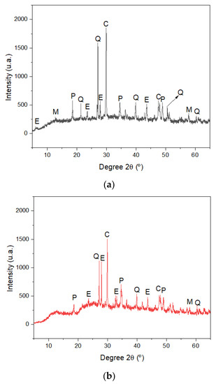 According to NBR 12653 [51], for a material to be considered pozzolanic, the sum of SiO2, Fe2O3 and Al2O3 values must be greater than or equal to 50%. Therefore, calcined coffee husks cannot be considered as a pozzolanic material. Also, according to NBR 12653 [51], there is a maximum SO3 value of 5%. In this case, only after the calcination process does the material comply with that recommendation. This information helps to understand why natural coffee husks were proved to reduce mortar strength when compared to the reference mortar. The presence of SO3 delays the hydration process of Portland cement, due to the formation of ettringite, which will be analyzed below [52]. On the other hand, the presence of K2O in the calcined coffee husk helps the hydration process due to its amorphism.