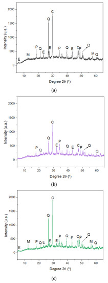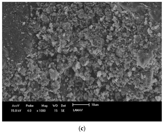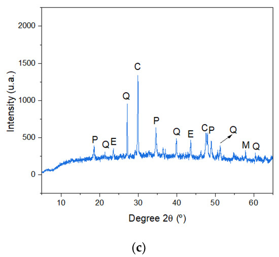 Figure 9 shows the presence of porosity in the mortar with a natural husk (Figure 9b), especially when compared to the reference composition. This information is concomitant with the water absorption results (Figure 4). Figure 9c presents a much more compact structure than the other images, related to the composition with calcined coffee husks. The presence of whitish crystals of irregular and hexagonal shapes is clear, which represent the presence of hydrated calcium silicate and portlandite. In Figure 9b, in addition to porosity, it is possible to observe the presence of needle-shaped phases, attributed to the formation of ettringite. The information is consistent with the information obtained from the XRD results (Figure 8).