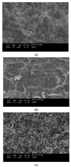 SEM results of the compositions: (a) reference; (b) natural; and (c) calcined.