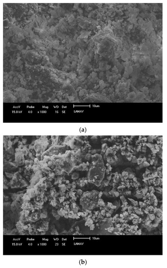 Calcium oxide (CaO) is the second-most present component in the husk, totalling 28.76% in the natural one and 21.99% in the calcined one. Silicon dioxide (SiO2), sulfur trioxide (SO3)), iron oxide (Fe2O3), titanium dioxide (TiO2) and diphosphorus pentoxide (P2O5) are present in smaller amounts. The chemical composition of calcined coffee husks depends on several factors, such as the temperature and burning time, organic material content, amount of silica and impurities and loss on ignition. According to research, the composition can vary greatly depending on the calcination method adopted [50]. However, it is possible to identify a pattern: there was an increase in the K2O content from 46.32 to 66.10%. Furthermore, the potassium found in roasted coffee husks is probably amorphous and more reactive.