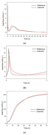 A crucial point of the research is to understand how the calcined coffee husk affects the cement hydration process. With this objective in mind, the calorimetry test was conducted, as shown in Figure 10. It is known that the hydration reaction is divided into 5 periods: (1) initial reaction, which takes place in the first peak of heat around 30 min; (2) dormancy period; (3) acceleration period; (4) period of deceleration; and (5) slow reaction period [47,55]. The initial reaction occurs due to the reaction of C3A with gypsum, promoting the formation of ettringite [56]. The reference sample has a first heat peak, relative to the initial dissolution, of approximately 12 mW·g−1, while the sample with calcined coffee husks has a value of around 10 mW·g−1. The values are remarkably close, even though the sample with calcined coffee husks has a lower initial dissolution rate. This indicates less initial ettringite formation since cement hydration is accelerated by the presence of, most likely, potassium oxide.