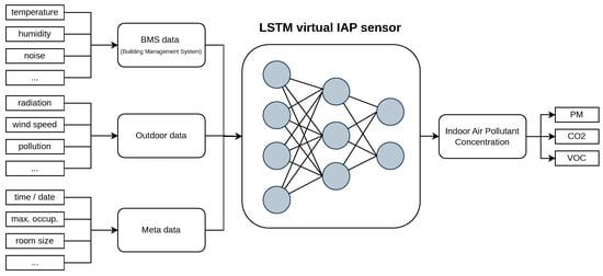 Other studies have already examined the applicability of virtual sensing for indoor air pollutant prediction. A study by Gabriel and Auer [] used multi-layer perceptron (MLP) artificial neural networks and support vector machines (SVM) to create an observational virtual particulate matter sensor based on available Building Management System (BMS) data (temperature, pressure, humidity, sound, illumination, window opening state, and printer power consumption). Six months of measurement data were used to train and test the two machine-learning models. Gabriel and Auer [] found that MLPs performed best, and the results indicated that physical particulate matter sensors could be replaced by virtual sensors based on BMS data. Kusiak et al. [] created virtual replacement sensors for temperature, humidity, and CO2 with four modeling approaches for the calibration and monitoring of physical sensors using HVAC, climate, and other indoor air pollutant data. MLPs were found to perform best in modeling the physical sensors. Kusiak et al. [] conclude that the virtual sensors are able to detect failures of their corresponding physical sensors and replace them if necessary. Skoen et al. [] used MLPs to create an observational virtual sensor using temperature and humidity as input for modeling CO2. Skoen et al. [] concludes that estimating CO2 only based on temperature and humidity is difficult and requires additional measurements to support the black-box model. Leidinger et al. [] created a virtual replacement sensor for selective VOC sampling of formaldehyde, benzene, and naphthalene using an array of low-cost MOS sensors as input. Leidinger et al. [] used linear discriminant analysis to estimate the target variables. Under laboratory conditions, the study achieved a classification ratio of over 99%. However, in field tests, the classification ratio significantly dropped (83%) due to VOC emissions of the hardware []. A summary of Literature on Virtual Sensor Creation is given in Table 1. Research in other domains showed that long short-term memory (LSTM) recurrent neural networks are suited for time-series data in virtual sensor creation due to their ability to incorporate measurements from a lookback window into their model. LSTMs are recurrent neural networks specialized in time series data by incorporating memory cells in their network architecture, which enable them to identify and remember patterns in time series data []. In the building industry, LSTMs have already been applied to building load management for forecasting energy consumption [,] and predicting occupancy []. LSTMs have not yet been applied to modeling virtual indoor air pollutant sensors.