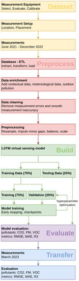In this study, we employed an LSTM model trained on collected measurement data to predict indoor air pollutant concentrations using BMS, outdoor meteorological, and outdoor pollution data as model inputs. In the following sections, we detail the methods used. Section 5.1 describes the steps performed in order to build the dataset, including the measurement equipment, the measurement setup, and the measurement location. Section 5.2 presents the steps to preprocess the data for machine learning model training. Section 5.3 encompasses the training of the models, while Section 5.4 focuses on model evaluation. Finally, the transferability tests are detailed in Section 5.5.