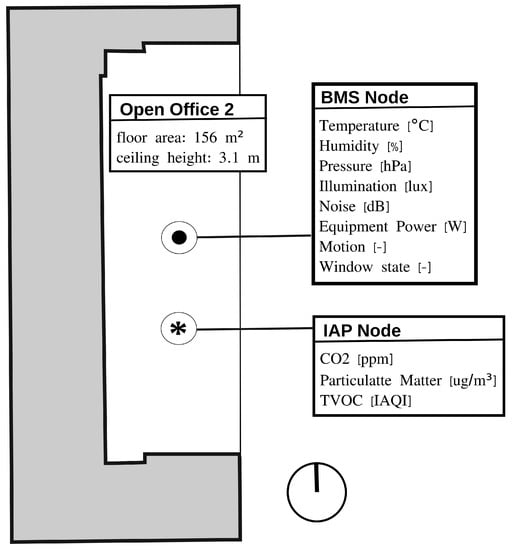 Measurement equipment was developed for indoor air pollutant (IAP) measurements. The measurement infrastructure for the BMS, meteorological, and outdoor pollution data was already in place. The BMS is implemented based on the LoRaWAN standard. LoRaWAN is a wireless IoT standard that achieves long-range communication with low power consumption, thus enabling battery-powered nodes. Due to the minimal installation effort and battery-powered nodes, it is applicable as a retrofit solution. The BMS data recorded measurements at a 1 min interval.