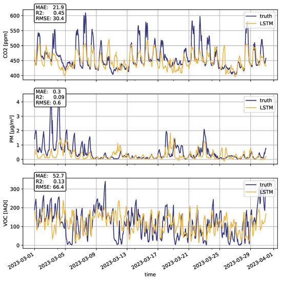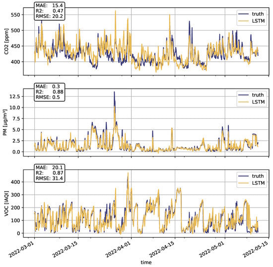 Table 3 summarizes the evaluation metrics (R, RMSE, MAE) for each pollutant. Overall, the model exhibits a low error for all pollutants, as demonstrated by the MAE and RMSE performance metrics. In the case of CO2, the mean absolute error amounts to 15.4 ppm for the testing period, while a slightly increased RMSE value of 20.2 ppm indicates that no outliers significantly impact the model’s predictions. The CO2 measurements ranged from 380 to 560 ppm during the measurement period. For particulate matter, the errors amount to 0.3 and 0.5 μg/m for MAE and RMSE, respectively, indicating consistently low error rates without outliers. The measurements ranged from 0 to 13 μg/m during the measurement period. In the case of volatile organic compounds, MAE and RMSE errors amounted to 20.1 IAQI and 31.4 IAQI, respectively, demonstrating low error rates without major deviations. The measurements for VOC ranged from 0 to 450 IAQI. The R performance metric is a statistical measure representing the goodness of fit of the LSTM model and indicates the percentage of variance in the truth data that can be explained by the LSTM model. In the case of CO2, an R value of 0.47 indicates that the model explains a substantial part of the variance in CO2 concentration and has a reasonably good fit, providing meaningful predictions. For PM, a high R of 0.88 was identified, indicating that the model explains a significant percentage of the variability in particulate matter measurements. Furthermore, it shows a very good fit and indicates that the model is highly predictive of PM. In the case of VOC, a high R of 0.87 was identified, which shows that a significant percentage of VOC volatility is explained by the LSTM virtual sensing model. Furthermore, the R indicates a very good fit for VOC and that the model is highly predictive.