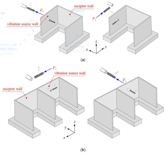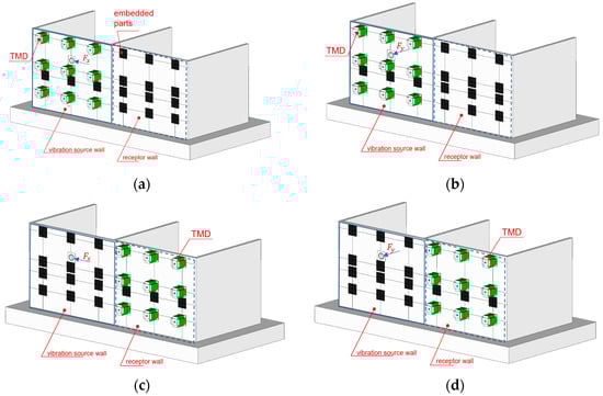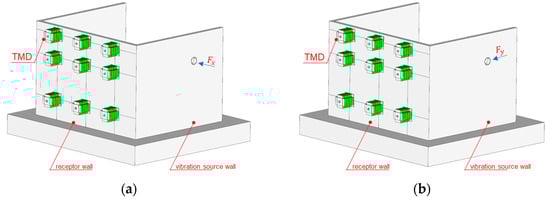 - The tests of U-shaped and W-shaped walls have verified that using dTMD can significantly reduce the vibration of RC walls in the frequency range of 200–450 Hz. The comparison results of controlled and uncontrolled frequency responses of U-shaped and W-shaped walls indicate that arranging dTMD on the target-controlled receptor wall can effectively control the broadband multimodal vibration of the receptor wall from 200 to 450 Hz. The comparison results of the W-shaped wall’s controlled and uncontrolled frequency response indicate that arranging dTMD on the vibration source wall can effectively control the broadband vibration of the receptor wall from 200 to 450 Hz. dTMD can effectively control both lateral and longitudinal excitation of pipelines;