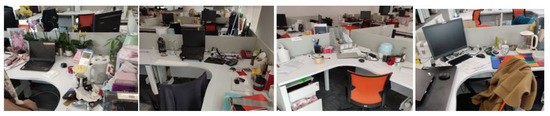 A progressive three-stage survey was conducted, and the results of each stage served as the guidance for the main points of investigation for the next stage. The office environments were observed, and the office workers were interviewed. Then, two online questionnaire surveys were performed. The office environments had the characteristics that each office worker had their own work desk and chair, as well as shared an office with several colleagues. Some office environments are shown in Figure 1. According to observations of office environments, the collaborative scenarios of using traditional and intelligent office products are common in the office. The products in the office were classified into electronics in office work, office appliances for the environment, office furniture, document supplies, record supplies, and other supplies. The common items are shown in Table 1.