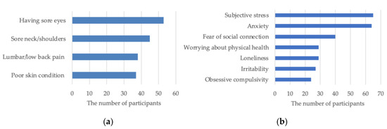Electronics in office work such as computers, mobile phones, and related accessories are the most commonly used products in workspaces. The majority of interviewees expressed that they were worried about health after using the computer for a long time. Most participants recruited for the questionnaire of the office worker concerns thought that having sore eyes was the most common item for physical discomfort caused by work, and the other three top items were sore neck/shoulders, lumbar/low back pain, and poor skin condition, respectively, as shown in Figure 2a. The results of run tests for the data in Figure 2a are given in Table 2. The values of significance, 0.819, 0.678, 0.763, and 0.625, were larger than 0.05. It means that the data were essentially random. The majority of the participants of this survey paid attention to their health through sports and regular health checkups, as well as by placing toys, pillows, and plants in the office to make the work space more comfortable. Participants also had certain preferences for desktop textures, including 59.78%, 17.39%, and 13.04% for wood grain, metal texture, and plastic texture, respectively. For mental health, as shown in Figure 2b, subjective stress and anxiety were the two items of highest concern, and the fear of social connection, worrying about physical health, loneliness, irritability, and obsessive compulsivity were also considered for participants recruited for the questionnaire of mental impacts. The data shown by Figure 2b were verified as random by the results of the run tests shown in Table 3. The above concerns of physical and mental health indicated the needs of office workers regarding health during long-term work.