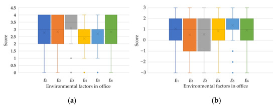 From the interviews, office environmental factors such as light, sound, and air quality were the biggest concerns of staff in office environments. Using humidifiers, air conditioning, and other related products or putting more plants indoors are common ways to improve the comfort level during working hours. Meanwhile, the majority of interviewees also paid attention to the organization of their working spaces, e.g., the cleanliness of working desk, the distance from others, as so on. We defined the office environmental factor as Ei, where , and . N is the set of integers. According to the interviews, E1~E6 represent light, sound, air quality, color, the cleanliness of working spaces, and the spatial distance from another’s working space, respectively. The corresponding attentions of the office workers to E1~E6 were investigated by the questionnaire for office worker concerns. The score was ranked from 0 to 4. The score of no attention was 0, and the score of great attention was 4. As shown in Figure 3a, air quality and sound had great impacts, with the scores of 3.09 and 2.84, respectively. Color had the least impact, with a score of 2.36. The other three factors resulted in similar scores. The psychological impacts of these factors on office workers were investigated by another questionnaire. The score was ranked from −3 to 3, where the absolute value of the score represents the level. The scores with minus sign, zero, and the positive scores mean negative impact, no impact, and positive impact on office workers, respectively, from the psychological view. As shown in Figure 3b, each environmental factor had a positive score. It means that the factors considered by office workers impacted them positively in their past experiences. The cleanliness of working spaces showed an average highest score, which indicates that it had the highest psychological impact on office workers. The scores of light, the spatial distance from another’s working space, and color were around 1; additionally, air quality and sound showed the lowest impacts.