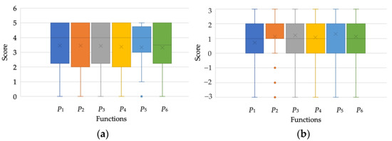 Remembering to drink water, air purification, lifting of the desktop, health detection, muscle massage, and sedentary reminders constituted key intelligent functions from the user-centered view according to the results of environmental observation and interviews. The six functions were defined as Pj, where , and . The affections to intelligent functions were investigated using a scale range from 5 to 0, which depicts from “like” to “don’t like,” respectively. The results are shown in Figure 4a. The affections to the functions of P1~P4 were basically similar and better than P5 and P6. The six functions had correlation properties. For example, P1 had relatively strong correlations with P2 (s = 0.732) and P4 (s = 0.638). The psychological impacts on office workers were also asked on a scale of −3 to 3, where the absolute value of score represents the level. As shown in Figure 4b, the six intelligent functions showed positive psychological impacts on office workers, especially those of P5 and P3, which had average scores of 1.35 and 1.2, respectively. The scores of P2, P4, and P6 were around 1. P1 showed the lowest impact.