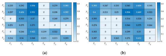 Both the office environment and the intelligent functions of office products have impacts on the user experience. The correlation analysis between office environmental factors E1~E6 and P1~P6 was calculated using Spearman correlation coefficients from two perspectives: the concerns of office workers and the psychological impacts on office workers. The results are shown by Figure 5. The zero values mean that the p-values did not meet the requirement of significance, and the others were the correlation coefficients, which were larger than the critical value. According to the data in Figure 5a,b, some intelligent functions had correlations with some office environmental factors in both perspectives, while others did not have correlations. For example, water-drinking P1 and air purification P2 both showed relatively strong correlations towards the air quality E3 from the two points of view. However, the correlations between P2 and the color E4 were quite different from these two perspectives. These quantified correlations can help to build the relationship between office workers, office environments, and intelligent functions, as well as benefit the design of intelligent environments that are applicable to different needs in the office.