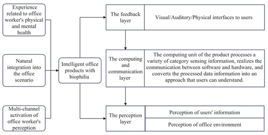 Intelligence in office environments is displayed by intelligent office products to a large extent. In order to make office environments feature intelligent functions that meet the needs of the office group, a design framework was proposed that integrates the patterns of biophilic design in the office. Based on Table 4, Table 5 and Table 6 and considering the complexity and the order of the information interaction, the corresponding design framework for intelligent products in the office contained three layers, i.e., the perception layer, the computing and communication layer, and the feedback layer, as shown in Figure 6.