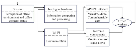 The Internet of Things (IoT) is often used for information interactions between intelligent office products to achieve the intelligent experience of the office group and the diversified needs of work forms. Intelligent products based on the IoT usually contain software and hardware modules, such as core processors, wireless communication, information monitoring, and an interface. In order to implement the framework shown in Figure 6, the corresponding intelligent office products based on the IoT can be established through intelligent hardware, Wi-Fi modules, sensors, APP/PC interfaces, buzzers/LEDs, and other electronic components. The general information interaction pathway based on the IoT among office environments, office workers, and intelligent office products is shown in Figure 7.