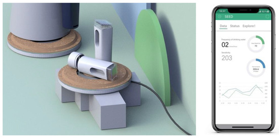 A design scheme of an intelligent office product that mainly focuses on reminding to drink water (P1) is proposed based on Figure 8. It consists of the handle module and the coaster module. The handle module has the characteristics of easy assembly and disassembly and can be used together with existing cups of the office desktop. It also reserves function access ports for meeting personalized demands. The details of the biophilic performance for this design scheme are shown in Figure 8.