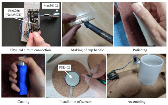 An interactive prototype was used for the evaluation of the design scheme. The developing requirements for the interactive prototype included several items. Firstly, it needed to connect with the IoT in the office. Then, the data, such as the office workers’ heart rates and the weight of the water in cups, could be collected in real time. Thirdly, the office group needed to be able to see the data through mobile access. Max30102 and FSR402 sensors were chosen to perceive the users. Based on Blynk and Arduino, the data from the sensors were computed and processed. The implementation details of the interactive prototype are shown in Figure 10.