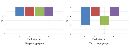 Participants were divided into the prototype group and the concept group. We defined the evaluation set as , where represent the willingness for use in an office environment, the biophilic performance, the need of function for heart rate detection, and the need of function for the reminder to drink water, respectively. A total of 14 participants were recruited, and their scores were ranked from 0 to 3. The prototype group was asked to use the prototype during one hour of working, and the concept group was provided the rendering and the illustration of this design scheme. The evaluations are shown by Table 7 and Figure 11.