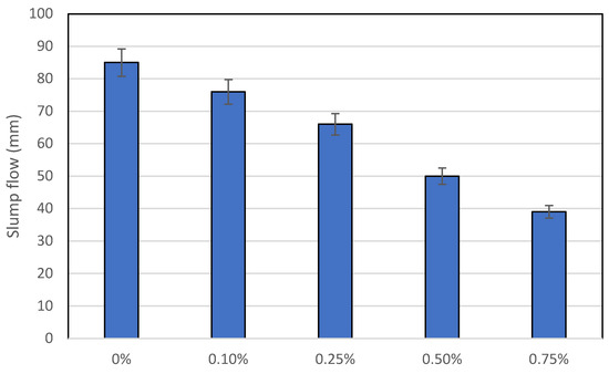 Figure 2 displays the slump flow of concrete containing JF and the control mix without JF. It can be seen that the control mix with 0% JF has high flowability as compared to mixtures containing JF content. The value of slump flow for the control mix is 85 mm. It was observed that the inclusion of JF has negative effects on the flowability of concrete. The addition of 0.10% JF results in a reduction of flowability by 10.5%. The further inclusion of 0.25% JF in concrete decreases the slump flow by 22.3%. The addition of 0.50% JF reduces the flow of concrete by 41.1% in contrast to the control mix. A maximum reduction of flow was observed following the inclusion of 0.75% JF, which is 54.11% less than the control mix. Given that JF is a hygroscopic material, it is evident that the incorporation of JF reduces droop flow. Hygroscopic materials have the tendency to absorb water; therefore increasing the JF content in concrete decreases the slump flow. Another reason for the reduction in slump can be the very strong bonding and cohesion between cement paste and JF. In the prior study carried out by S. Islam et al. [32], it was revealed that the addition of JF in concrete results in lessening the flowability of the material. According to the research conducted by Rakibul Hasan et al. [52], the inclusion of 0.75% JF in concrete has been found to yield satisfactory results in terms of flowability, though more than 0.50% inclusion of JF in concrete enhances the viscosity and constancy of concrete.