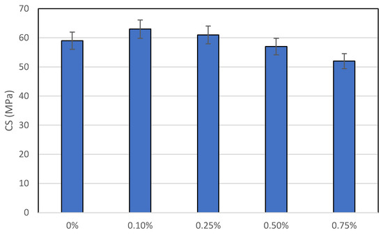 The CS of concrete blended with variable percentages of JF can be seen in Figure 3. The control group lacking the presence of JF exhibits a CS of 59 MPa. The incorporation of JF into concrete exhibits a positive correlation with its CS, up to a certain point, beyond which, the accumulation of JF leads to a reduction in the CS of the concrete. With the inclusion of 0.10% JF in concrete, the CS increases by 6.77%. Further inclusion of 0.25% JF increases the CS by 3.38%. It can be seen that this is the optimum percentage of JF to be added to concrete in this mix. Increasing the content of JF by more than 0.10 reduces the CS. The inclusion of 0.50% JF decreases the strength by 3.39% in contrast to the control sample. The addition of 0.75% JF decreases the strength by 11.86% compared to the control sample. Only a 0.10% addition of JF in concrete leads to the best results in this investigation, in contrast to other mixes with different percentages. In the previous study performed by Mohammad H. Elgawish et al. [53], the inclusion of 0.25% to 0.50% JF in concrete having the length of 18 ± 2 mm enhanced the CS of concrete by 15%. Islam and Ahmed [32], found that adding 0.50% JF, having a length of about 20 mm, enhanced the strength of concrete slightly. The addition of an excessive amount of JF in concrete reduces the CS because an excessive content of JF causes clusters and agglomeration within the concrete mix. The improper mixing or addition of JF causes the evolution of voids in concrete, which leads to a reduction in the concrete’s strength. An excessive amount of JF content in concrete also disrupts the cement hydration process, which is also the main reason for the reduction in the CS of concrete.