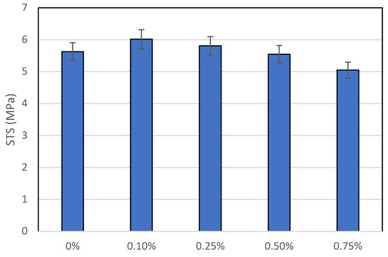 Figure 4 depicts the STS of concrete. The control sample has an STS of about 5.62 MPa. While the addition of JF in concrete results in an increase of the STS to some extent. The inclusion of 0.10% of JF in concrete increases the strength by 6.91%. While if the percentage of JF is increased to 0.25%, the STS increases by 3.21%. Furthermore, the addition of 0.50% JF results in a decrease of the strength by 1.4%. If the addition of JF is increased to 0.75%, the STS of concrete is reduced by 10.29%. From the investigation, it is clear that a 0.25% addition of JF in concrete is the optimum percentage to be utilized, which increases the strength to the maximum extent. The experimental study carried out by Elgawish and Zakaria [53] found that the addition of 0.10–0.50% JF in concrete with 10–20 mm of length enhances the STS of concrete. Similarly, study carried out by Tiezhi Zhang et al. [54], The optimal percentage range for maximizing the rigidity of concrete is between 0.25% and 0.50% JF fiber, with a length of 18 ± 2 mm. JF increases the toughness of concrete, which allows the concrete to undergo distortion under tensile stresses. The ductile behavior of concrete enhances the STS of concrete. The STS is also improved because of the enhanced adhesion between the cementitious matrix and JF [55].