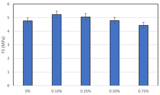 The FS of each mix is presented in Figure 5. The data indicate that the control mix possesses a FS of 4.76 MPa. The addition of 0.10% JF raises the FS by 9.63%, while further inclusion of 0.25% JF increases the strength by 5.88%. The data indicate that the inclusion of 0.25% JF in the mixture leads to a decrease in FS in comparison to the mixture containing 0.10% JF. This suggests that the optimal percentage of JF to be added to concrete is 0.10%, as increasing the JF content beyond this threshold results in a reduction in strength. The inclusion of 0.50% JF results in very low increases in FS that are almost equal to the control mix. Increasing the content of JF to 0.75% reduces the FS by 6.95% in contrast to the control sample. The ductility of concrete may be augmented through the incorporation of JF in the concrete matrix, thereby improving its capacity to undergo deformation prior to failure. This results in an increase in the flexural capacity of the concrete. Additionally, fiber acts as a reinforcement in concrete and forms a network in the cement matrix which evenly distributes the applied loads, as well as provides resistance to the loads, due to which, the FS of concrete increases. JF also enhances the bond with cementitious material in concrete, which improves cohesion and transfers the load to the surrounding matrix; this improved bonding increases the FS of concrete. According to the study performed by Islam and Ahmed [32], aside from the addition of 10 mm fiber at a dosage of 0.50%, the addition of jute fiber did not significantly increase the rigidity of the concrete beam’s fracture. The utilization of 10 mm fiber at a concentration of 0.50% resulted in a rise of approximately 6.0% in the modulus of rupture. At a fiber length of 20 mm, a decreasing trend in the modulus of rupture was observed across all three evaluated fiber concentrations (0.25%, 0.50%, and 1.00%). According to the results, the amalgamation of JF in a significant percentage of 1.0% demonstrated an adverse influence on the modulus of rupture. This was true independently of whether the aspect ratios of the fibers were 100 or 200. This phenomenon persisted despite variations in the length of the fibers.