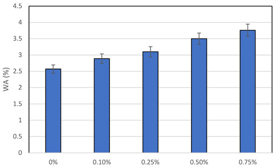 Findings about the WA influenced by the addition of JF in concrete are displayed in Figure 6. In comparison to the other ratios, it is evident that the proportion of WA present in the control mixture is significantly less than that observed in any of the other blends. The control mix exhibits a WA percentage of 2.57%. With the addition of JF in concrete, the WA increases because of its properties. With the inclusion of 0.10% JF in concrete, the WA increases by 12.45%. With the addition of 0.25% JF, the WA increases by 20.62%. Furthermore, the addition of 0.50% JF enhances the absorption of water by 36.18%, and the inclusion of 0.75% JF results in an increase of absorption by 46.30%. These results indicate that the addition of JF in concrete and WA are directly related; the absorption of water increases with the rise in JF content. JF is a hygroscopic material in nature, due to which, it can absorb the moisture content from its surroundings. The addition of JF in concrete results in the formation of porous elements within the concrete matrix. Because of this, the WA in concrete is increased, and this increase in WA provides adhesive effects on the concrete strength, increases the permeability, reduces the mechanical strength, and causes durability issues [6]. In the study carried out by Alomayri and Babar [56], the addition of 0.15% to 0.50% JF causes the WA to increase by 16.5%.