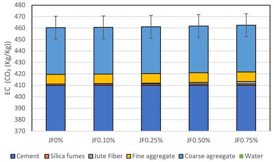 The EC values of all the proportions with varying JF content can be seen in Figure 7. The empirical data suggest that the inclusion of jute fiber has a negligible impact on the EC of the material. However, it should be noted that the introduction of jute fiber does result in a slight increase in EC. The control mix has the lowest EC: 460.34 CO₂ (Kg/Kg). The addition of a very small content of fiber increases the EC slightly. Concrete containing a JF content of about 0.10% has an EC of about 460.623 CO₂ (Kg/Kg). As the quantity of JF increases, the EC also increases. This shows that the EC is directly related to the addition of JF in concrete. Overall, there is not that much difference between the EC of the control mix and the mix containing JF. The maximum EC can be seen with the addition of 0.75% JF in concrete, which is 462.4625 CO₂ (Kg/Kg). JF is the sustainable material to be used in concrete, as per the findings.