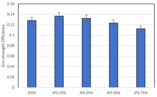 Though the EC of concrete has been determined for the assessment of concrete’s sustainability, concrete cannot be selected only on the basis of sustainability; other factors should also be considered before the selection of the appropriate mix. The ESE of concrete should be determined for the selection of the appropriate mix. The ESE is the ratio between the 28th day CS of concrete and the EC of concrete. The CS of concrete is considered for determining the ESE of concrete, as the CS of concrete is the principal characteristic of concrete. Figure 8 represents the ESE of each concrete mix. The ESE of the reference mixture is observed to be 0.128 MPa/kgCO2.m3. The addition of 0.10% JF increases the eco-efficiency by 6.71%. The addition of 0.25% JF to concrete yields a 3.23% rise in ESE, while the introduction of 0.5% JF causes a 3.68% decline in ESE relative to the control group. The addition of 0.75% JF to concrete reduces the eco-strength efficacy by 12.26% compared to the control mix. The concrete mixture containing 0.10% JF has the highest ESE and is more appropriate for use due to its minimal EC and high ESE.