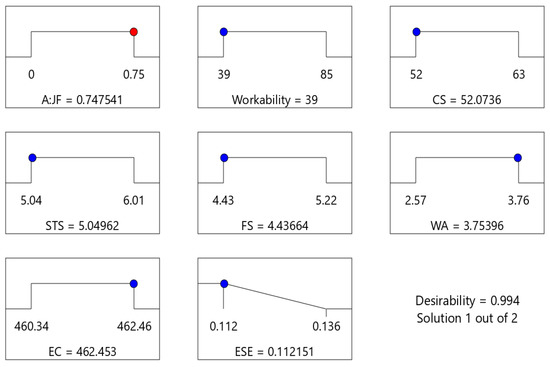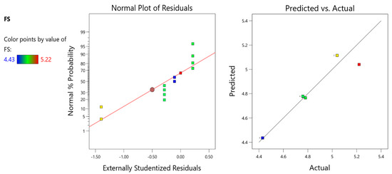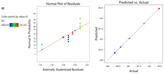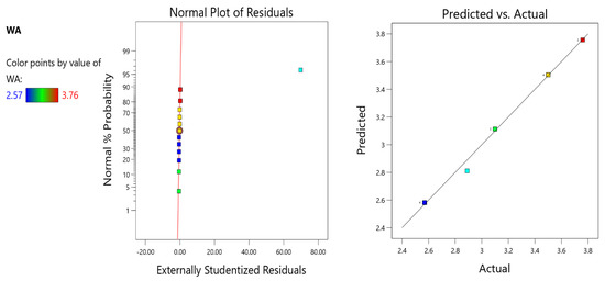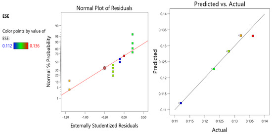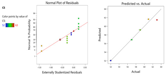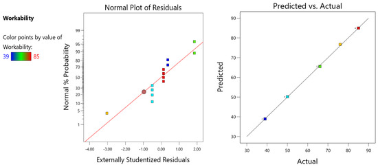 Various parameters, including Flowability, CS test, STS test, FS, WA, EC, and ESE, were investigated in the present study. The data were collected 28 days after casting and analyzed using graphs depicting real versus anticipated values, as shown in Figure 9, Figure 10, Figure 11, Figure 12, Figure 13, Figure 14 and Figure 15. The coherence of the models’ prognostications regarding the responses can be deduced from the observation that the data points congregated in close proximity to the line that yielded the most optimal alignment. The degree of conformity between the data points and the line of best fit in plots that compare actual and predicted values serves as an indicator of the similarity between the anticipated and observed outcomes [72]. The residual graphs for each response variable reveal a consistent distribution of sample points near the regression line. This finding supports the assertion that the designs are effective. This suggests that the residual terms followed a normal distribution. To summarize, the statistical outcomes obtained for each response have been assessed as satisfactory and fell within the acceptable range.
