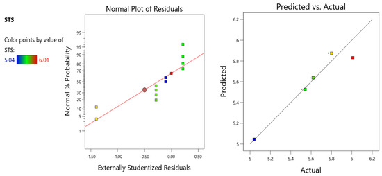 Normal plot of residuals (left) & predicted vs actual (right) values for STS.