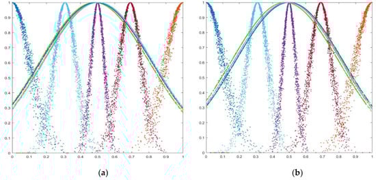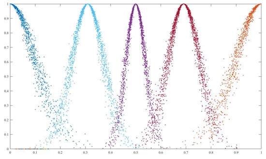The forward cloud generator and inverse cloud generator are Included in a cloud evaluation model, where the forward cloud generator generates cloud clusters from (Ex, En, He), and the inverse cloud generator extracts the core elements of clouds from the cloud clusters [63]. In the process of cloud evaluation, it is to compare the obtained result cloud with the standard cloud and finally determines the evaluation results. In the process of comparing cloud maps of results and criteria, the main observation is the central distribution position of the cloud (location of Ex) and the acceptable range (range formed by En). The position of Ex is generally to evaluate the value of an object, which can indicate its evaluation level. The range formed by En can be seen as the size of the fluctuation range of evaluated objects; that is, evaluating whether observations are susceptible to external influences and falling within what reasonable range [64]. The algorithm is shown in Equations (6)–(8).
