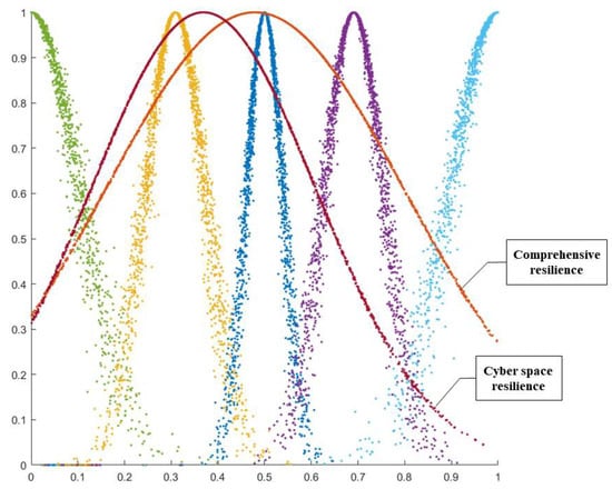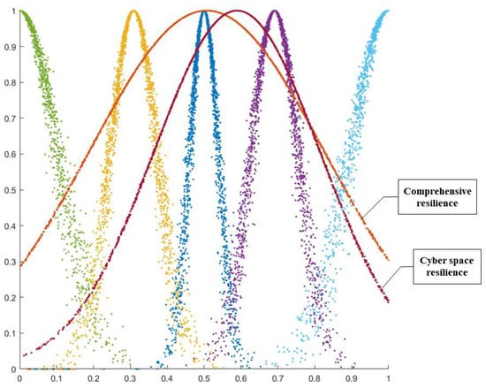 The physical space resilience of Changchun is basically above the “qualified” level and generally higher than the comprehensive evaluation results. The cyberspace resilience has a good development momentum, and it is also generally higher than the comprehensive evaluation results from 2016 to 2019. Taking 2017 as an example, the cyberspace resilience level, comprehensive resilience level, and evaluation criteria of Changchun are shown in Figure 6. In comparison, the evaluation results of societal space resilience are generally lower than the comprehensive evaluation results. Interestingly, however, when the cyberspace resilience intensity is higher, the societal space resilience intensity tends to decrease, which leads to the suspicion that the local government may neglect the development of societal space resilience when vigorously developing cyberspace resilience and vice versa. It may be the reason for the opposite trend of these two space resilience evaluation results.