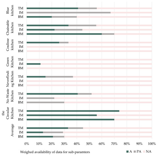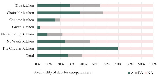 In total, 26% (85 out of 322) of the data were available, 12% (39 out of 322) were partially available, and 61% (198 out of 322) were unavailable. Some information was available (either A or PA) for 39% (124 out of 322) of the data. Since the CIK was developed using the CBC generator, it provided the highest amount of data: 70% of the data were either A (32 out of 46) or PA (0 out of 46). In some cases, the data for the CIK indicated that the sub-parameter was not applied. This was not counted as A or PA, therefore 100% A or PA was not reached. The website and publications regarding Chainable and Blue Kitchen also provided data for more than 50% of the sub-parameters: 57% (37% A and 20% PA) and 54% (28% A and 26% PA), respectively. On the other end, the website and publications regarding the NeverEnding Kitchen provided data for only 22% of the sub-parameters (9% A and 13% PA), and Coulisse Kitchen only provided data for 19% of the sub-parameters (15% A and 4% PA). The lowest amount of data was found for the website and publications regarding the Green Kitchen, which only provided data for 2% of the sub-parameters (2% A and 0% PA).