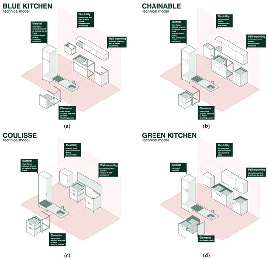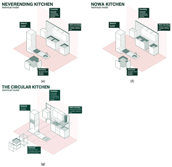 Figure 5e shows the technical model for the NeverEnding Kitchen. It is made of bio-based panels that can be assembled and disassembled by its “plug-and-play” concept. The modular cabinets are mounted on a modular retaining wall, and all the parts can be recycled at the end of use. The NoWa Kitchen very closely resembles the NeverEnding Kitchen and is illustrated in