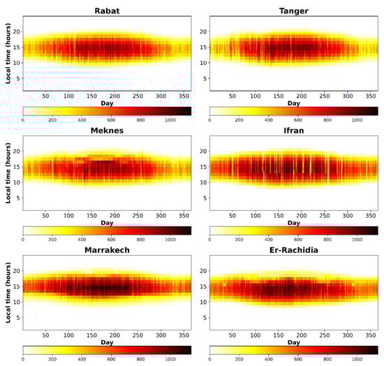 For a thorough analysis, our study will be conducted in 30 localities/cities well distributed across the country, 17 of which are equipped with meteorological stations that provide us with long-term data measured on the ground (ambient temperature, humidity, and total horizontal solar radiation). The collected data vary between 3 and 11 years, depending on the meteorological station. As for the remaining 13 sites, the data are from the Meteonorm database. This database is very well recognized and has been recommended and used by several researchers and software developers [48,49]. In addition, several studies have used this database to run their simulations. For instance, Lebied et al. [50] used the meteorological file provided by Meteonorm for Tetouan city to study an office building prototype located in northern Morocco. In addition, Figaj et al. [51] modeled and simulated a hybrid solar–solar-wind system dynamically, providing space heating/cooling, located in Gdansk, northern Poland, using this database.